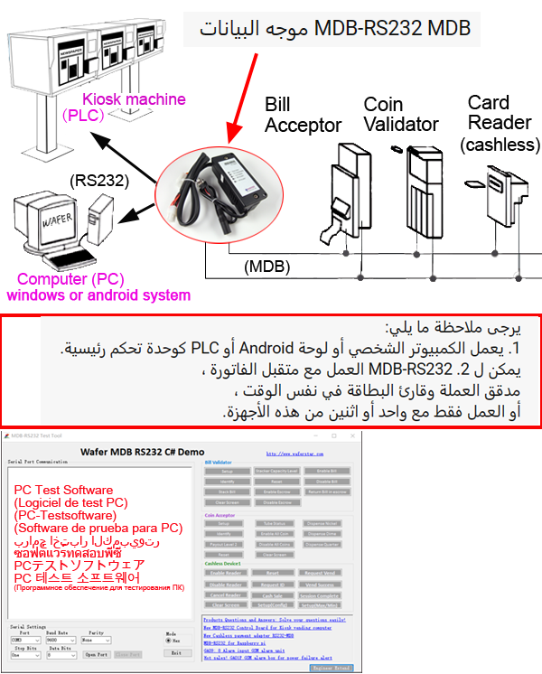 يمكن الآن توصيل جهاز الدفع NAMA Multi-Drop Bus (MDB) القياسي في صناعة البيع بجهاز كمبيوتر من خلال صندوق محول MDB-RS232. يسمح MDB-RS232 بقبول العملة وتوزيع التغيير وقارئ بطاقات الائتمان ومدقق الفواتير التي يتم التحكم فيها جميعا بواسطة VMC (واجهة RS232) ، مثل الكمبيوتر الشخصي أو PLC أو لوحة Android.